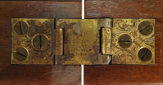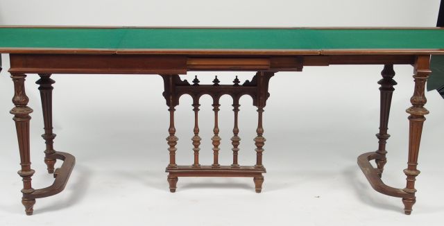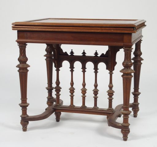 Table à jeux Napoléon III en placage de noyer, plateau se dépliant en trois parties.