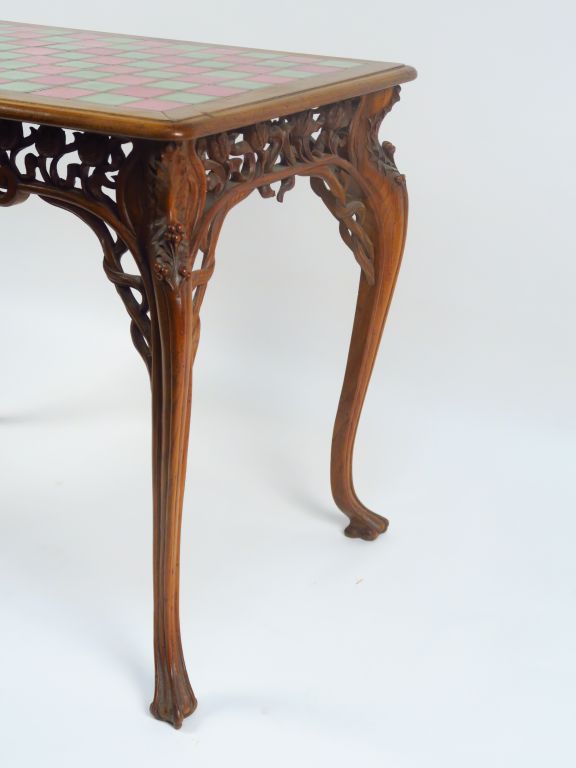 Table Art Nouveau en noyer mouluré et sculpté à décor de rinceaux et de fleurs. Dim. 88 x 59 x 72 cm