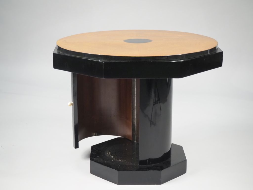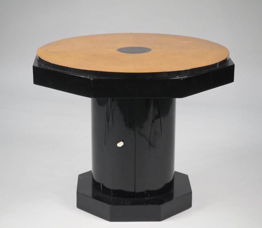 Table basse 1940 en bois noirci et bois clair, plateau à pans coupés. Dim. 60 x 77 x 77 cm