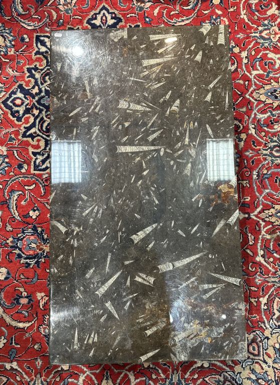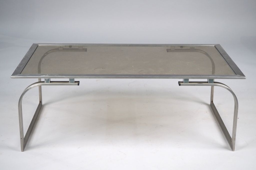 Table basse 1970 en métal chromé, plateau en verre fumé. Dim. 35 x 96 x 51,5 cm On y joint une plateau en marbre. Dim. 60 x 68,5 cm