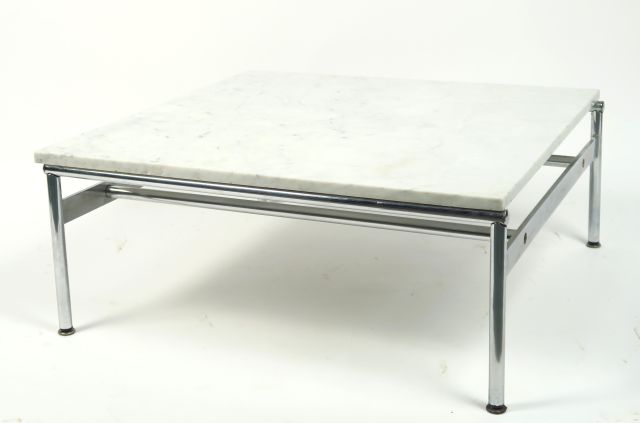 Table basse années 70. Piètement en métal chromé, dessus marbre blanc. Dim. 31,5 x 76 x 76 cm