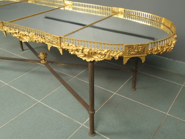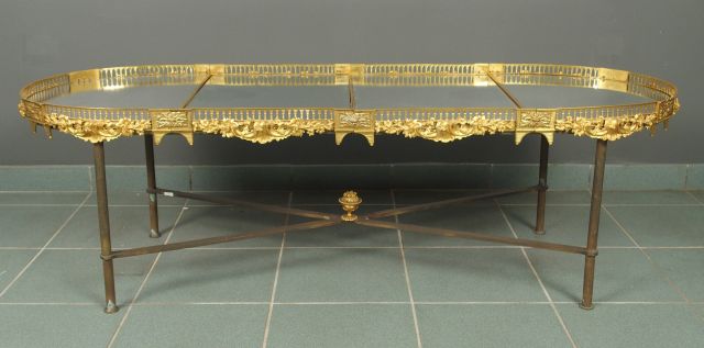 Table basse constituée à partir d'une grand surtout de table XIXème en bronze doré d'arcatures, de rocailles et de fleurs. 45 x 144,5 x 51 cm.