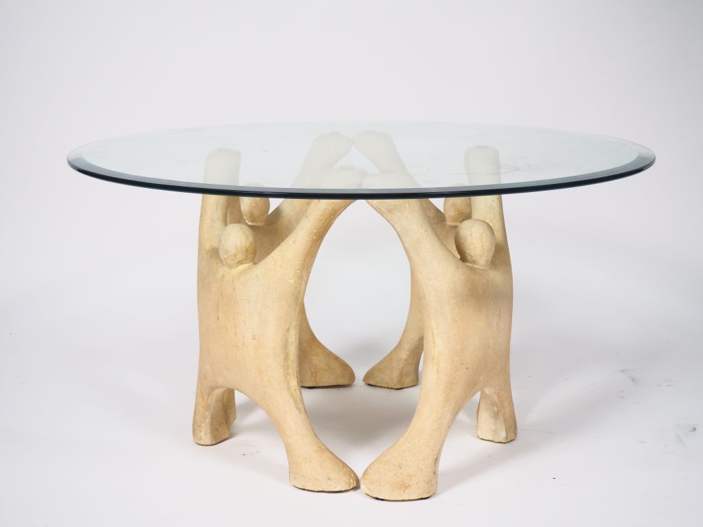 Table basse en verre et céramique, piétement en forme de ronde de quatre personnages. H. 48 cm Diam. 90 cm