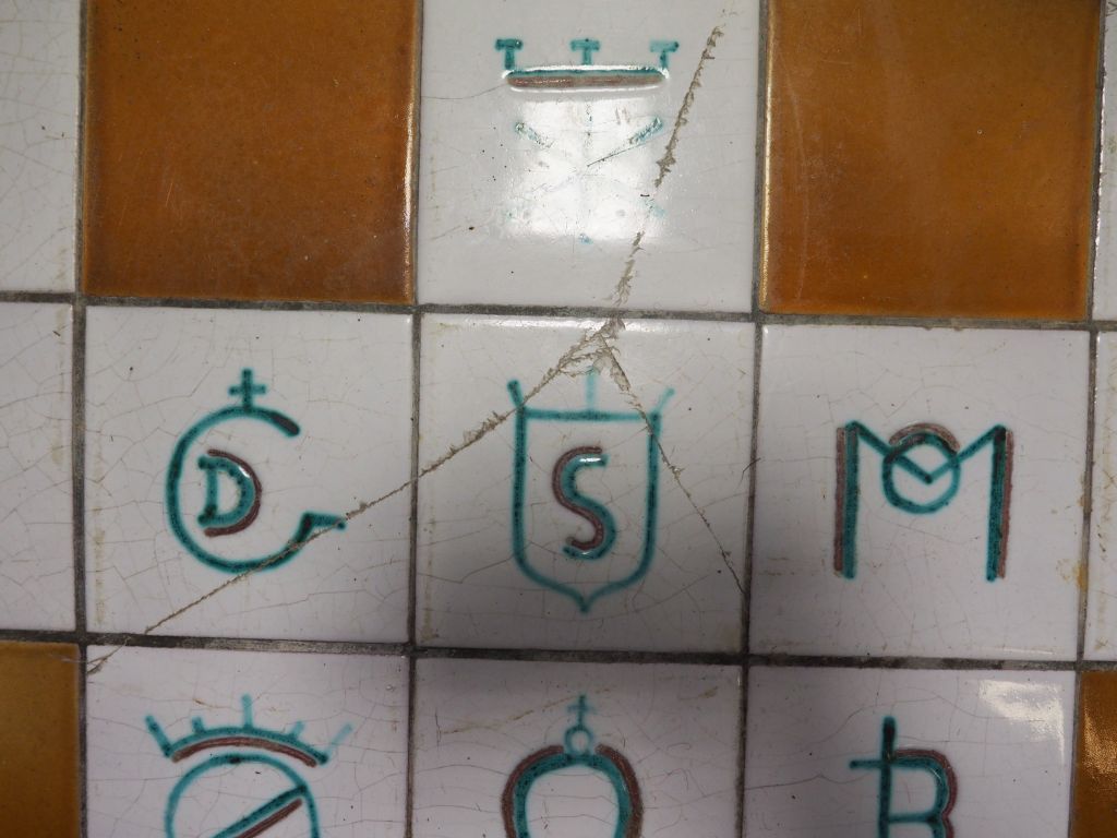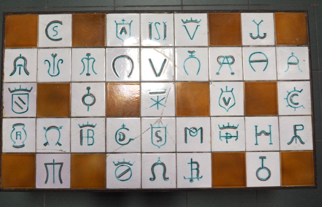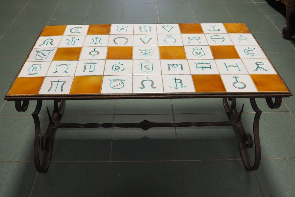 Table basse, plateau en céramique à décor de fers de manadiers. Dim. 45,5 x 93,5 x 54 cm.