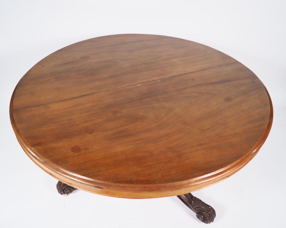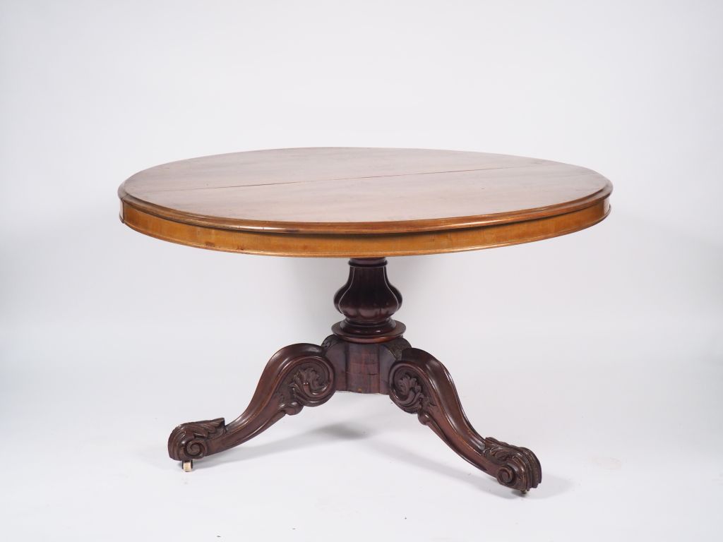 Table de salle à manger XIXème en acajou mouluré, modèle à allonges (3 dont une en acajou massif) et ceinture, piétement feuillagé.