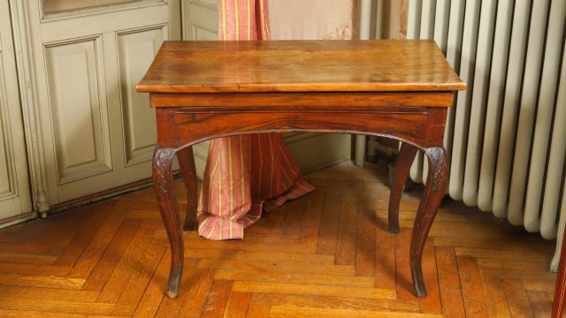 Table rustique de style Régence en noyer (mauvais état et transformations) Guéridon ovale de style Louis XVI en bois teinté, fileté de bois clair trois différentes chaises volantes