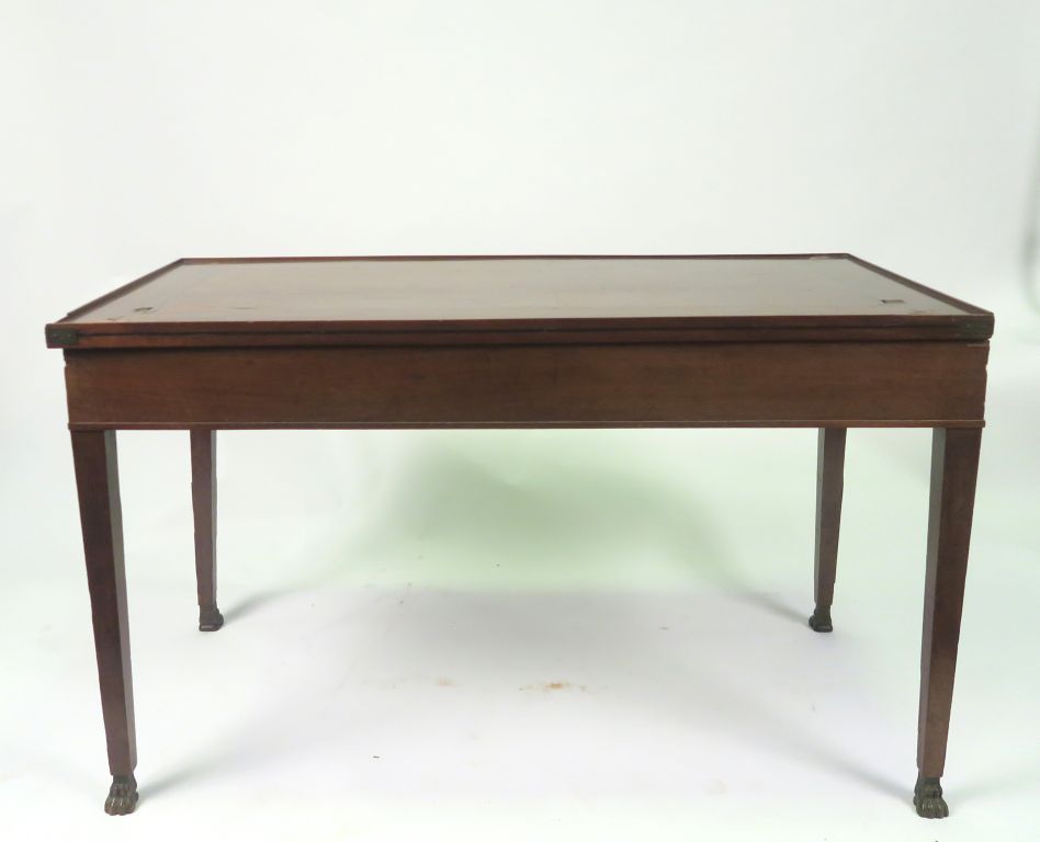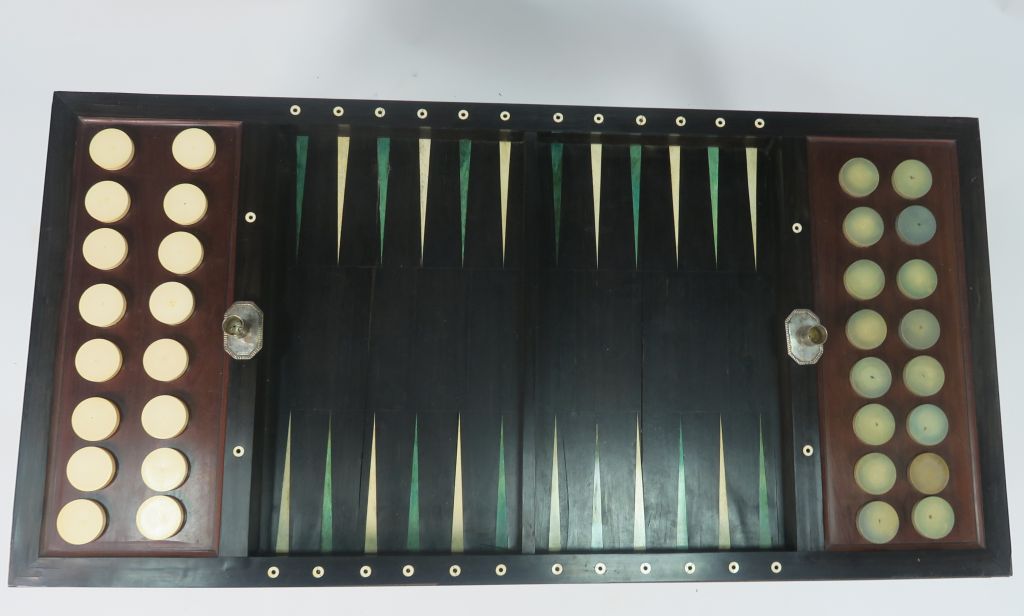 Table Tric-Trac début XIXème en acajou et placage d'acajou, pieds griffe. Avec ses bougeoirs et ses accessoirs. (accidents)