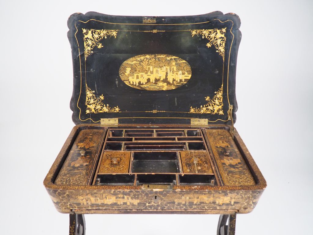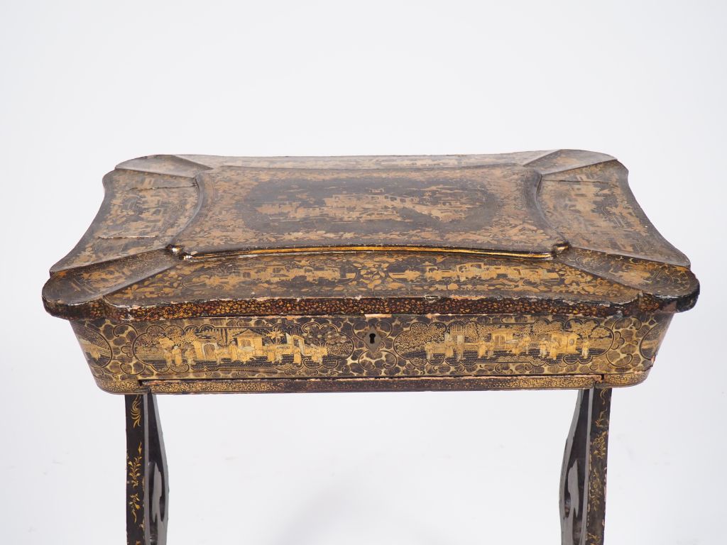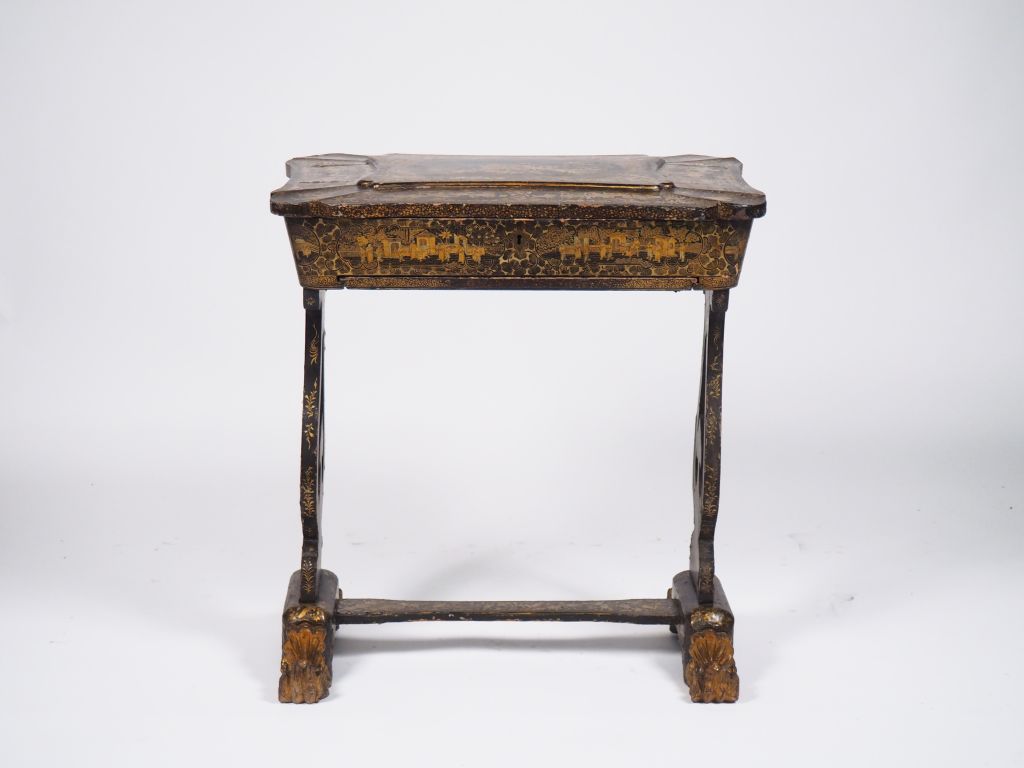 Travailleuse Napoléon III de style Extrême Orient, à décor doré sur fond noir, pieds griffe. Dim. 70 x 66 x 45 cm