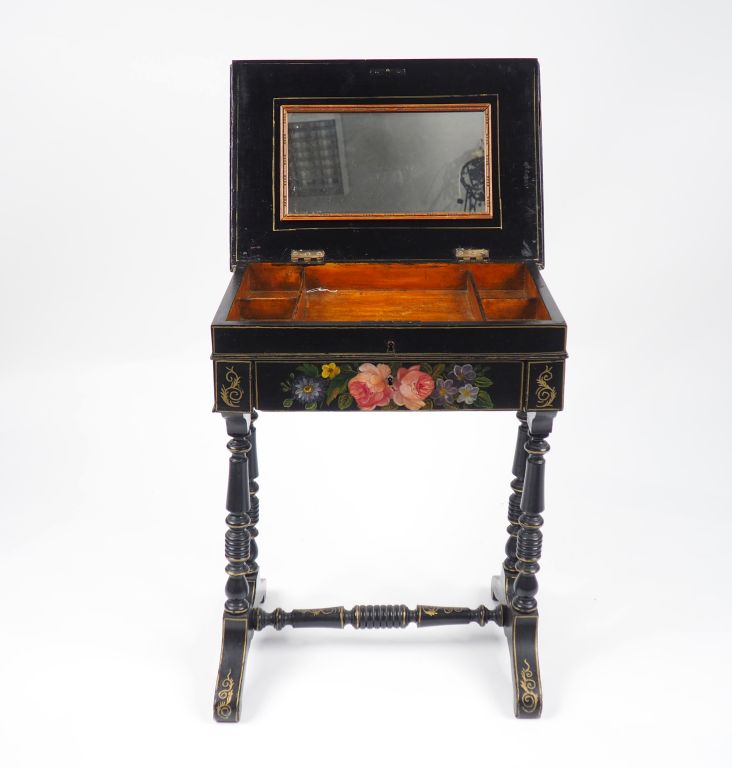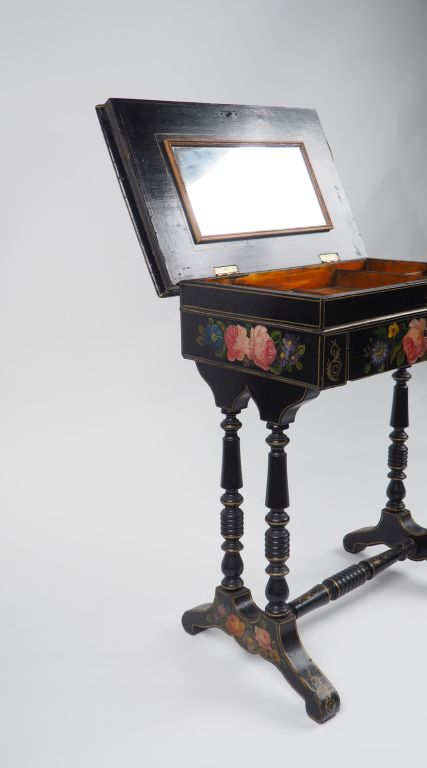 Travailleuse Napoléon III en bois noirci à décor de fleurs polychromes ouvrant à un tiroir et un abattant Dim. 67,5 x 51 x 35 cm
