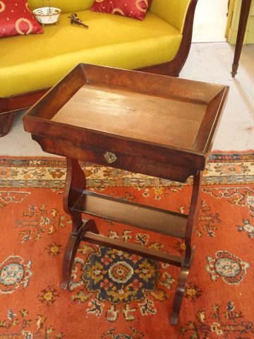 Travailleuse Restauration en acajou et placage d'acajou flammé, piètement en forme de balustre stylisée, un tiroir en ceinture