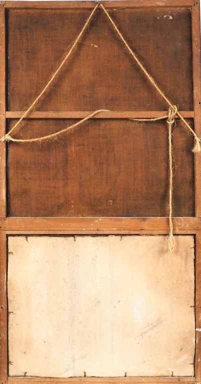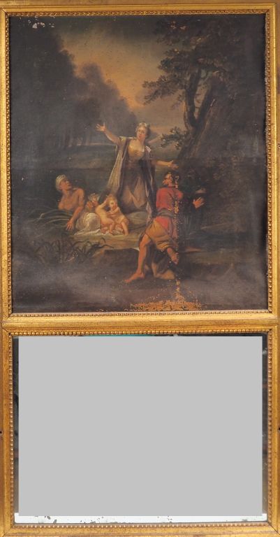 Trumeau fin XVIIIème-début XIXème en bois doré, peinture à décor de scène mythologique. (accidents) Dim. 136 x 72 cm