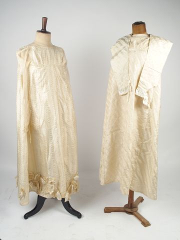 Un lot de 2 robes en soie XIX è siècle remaniées probablement pour la comédie, soie crème façonnée l'étoffe est en bon état général intéressant à ce titre. Expert : Véronique Dumont Castagné