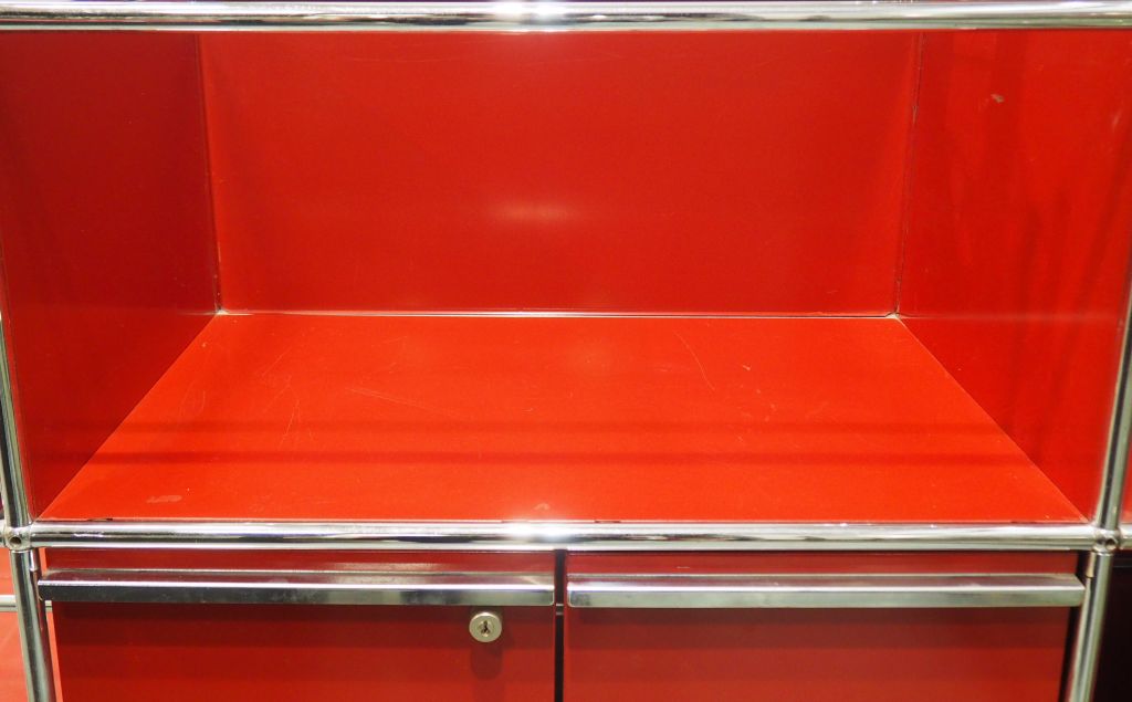 USM HALLER. Grande bibliothèque en tôle rouge et métal chromé 5 étages sur 3 rangées. (à remonter)