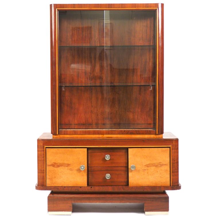 Vitrine 1940 en placage de palissandre et de bois clair, ouvrant à deux portes vitrées coulissantes, deux vantaux et deux tiroirs.