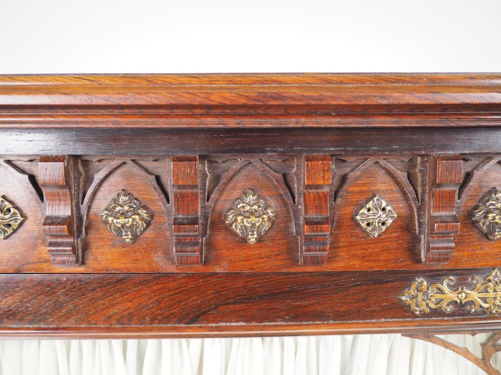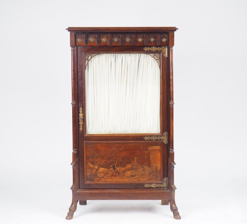 Vitrine basse 1900 en marqueterie, ouvrant à une porte, à décor de chevalier devant un château fort, pieds en sabot de biche. Dim. 120 x 69 x 38 cm