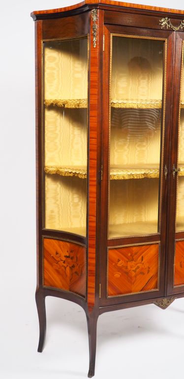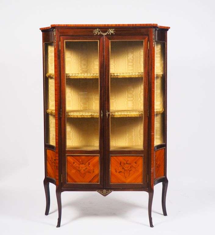 Vitrine de style transition Louis XV-Louis XVI en marqueterie à décor de fleurs. Dim. 158 x 107 x 35 cm