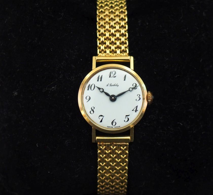 A. BARTHELAY Montre bracelet de dame, boitier et bracelet en or jaune 750. Cadran rond à chiffres arabes pour les heures. Bracelet souple, maille plate. Bouton poussoir, serti d'une pierre bleue en cabochon. Signée. Diam. 22 mm Long. 17 cm Poids tel. 28,44 g