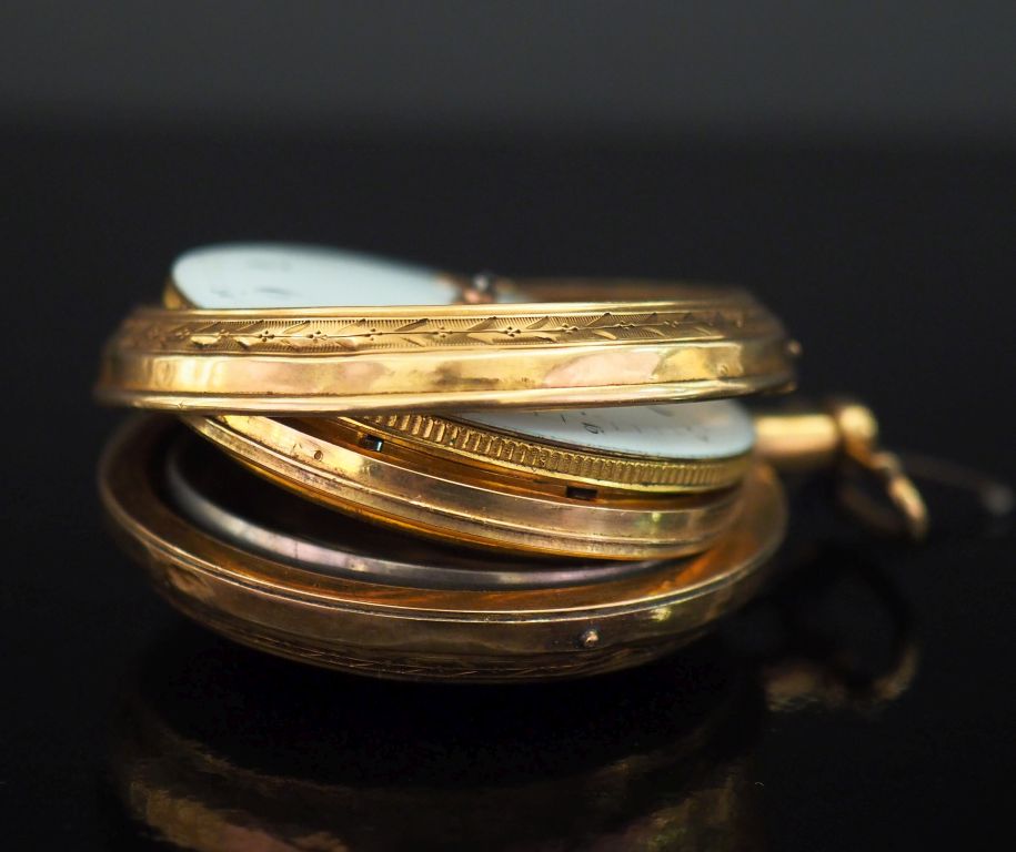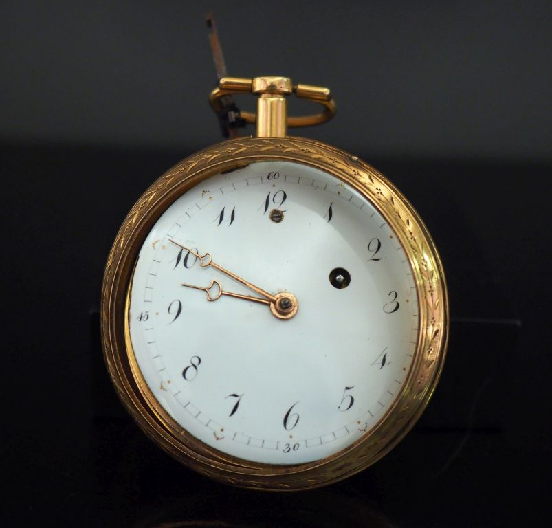 A.BEROLLA, à Besançon Montre de gousset fin XVIIIème début XIXème en or jaune 750. Cadran à chiffres arabes pour les heures et les minutes. Diam. 52 mm Poids tel. 112 g (manque le verre, accidents)