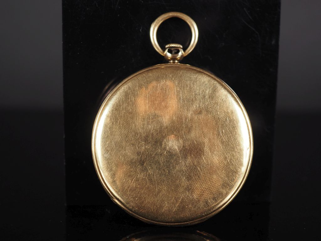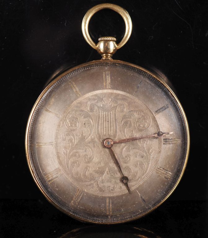 AUBERT, à Genève Montre de gousset en or jaune 750. Cadran à chiffres romains pour les heures sur un fond orné d'une lyre et de rinceaux. Double fonds en or jaune 750. Signée. Diam. 50 mm Poids tel. 71,36 g (usures)
