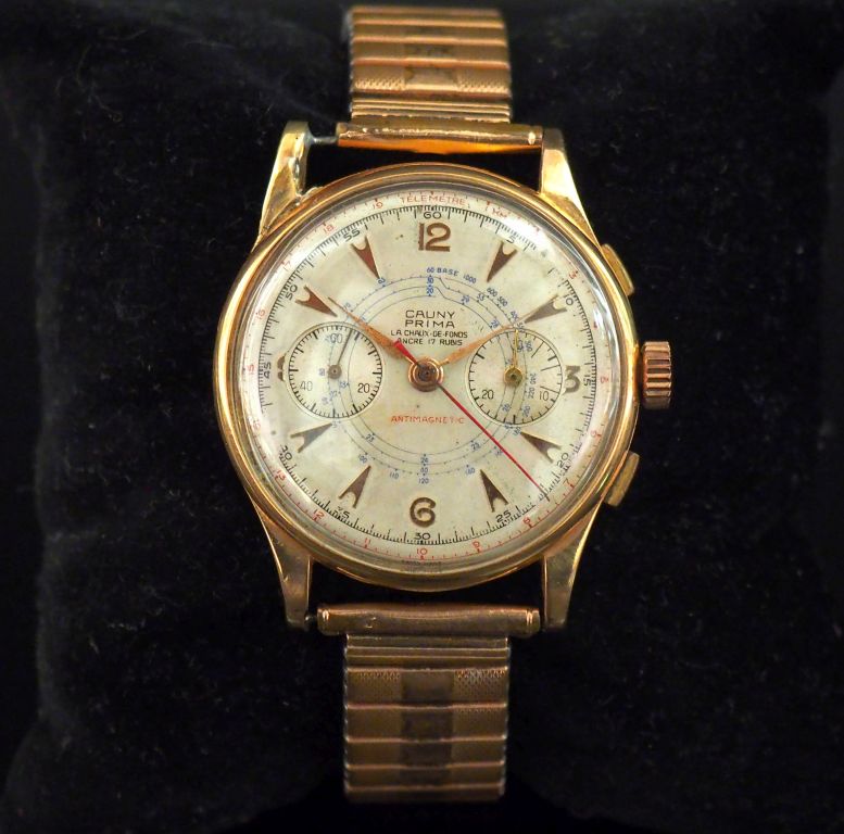 CAUNY PRIMA, La Chaux-De-Fonds. Montre d'homme, boitier rond en or jaune, bracelet en plaqué, Chronographe. Diam. : 32mm