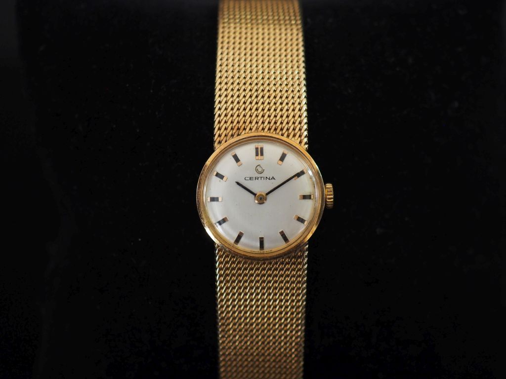 CERTINA Montre bracelet de dame, boitier et bracelet en or jaune 750. Cadran rond à index bâtons pour les heures. Bracelet souple, maille plate tressée. Diam. 20 mm Poids tel. 36,24 g