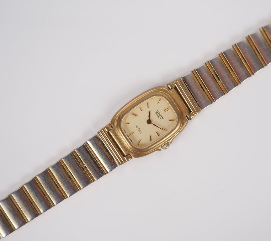 CITIZEN, Noblia Montre bracelet de dame en métal doré. Cadran à bords arrondis, index bâtons pour les heures. Bracelet articulé maille plate. Signée. (usures)