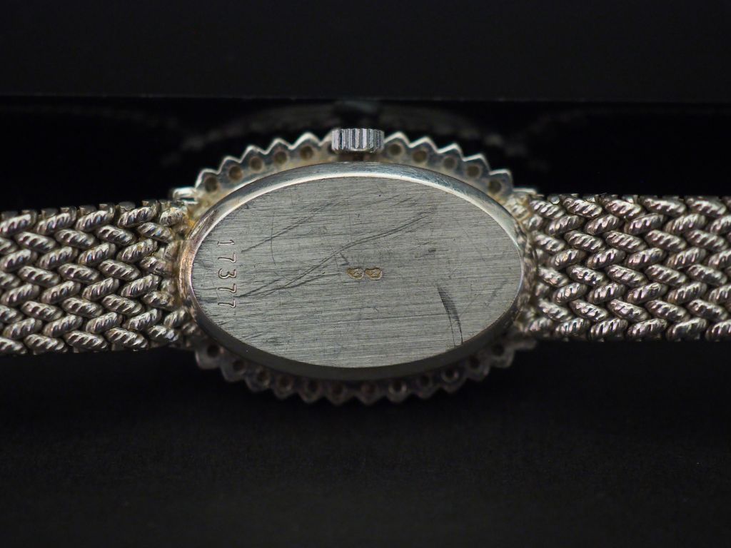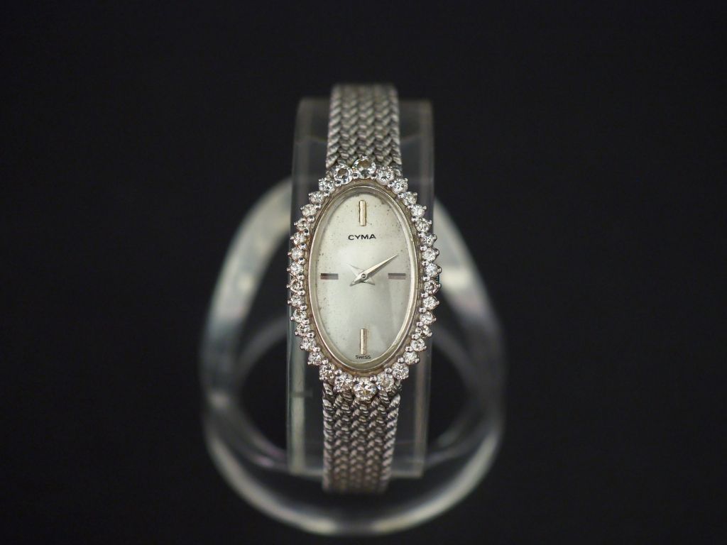 CYMA Montre bracelet de dame, boitier et bracelet en or blanc. Cadran ovale serti de diamants taille ancienne, index batons pour les heures. Bracelet souple, maille plate tressée. Signée sur le cadran. Numérotée au revers 17377. Long. 18 cm Poids tel. 40,43 g