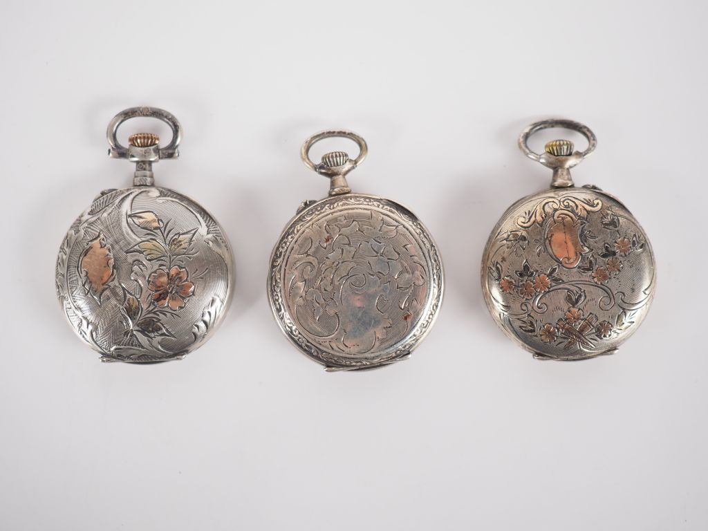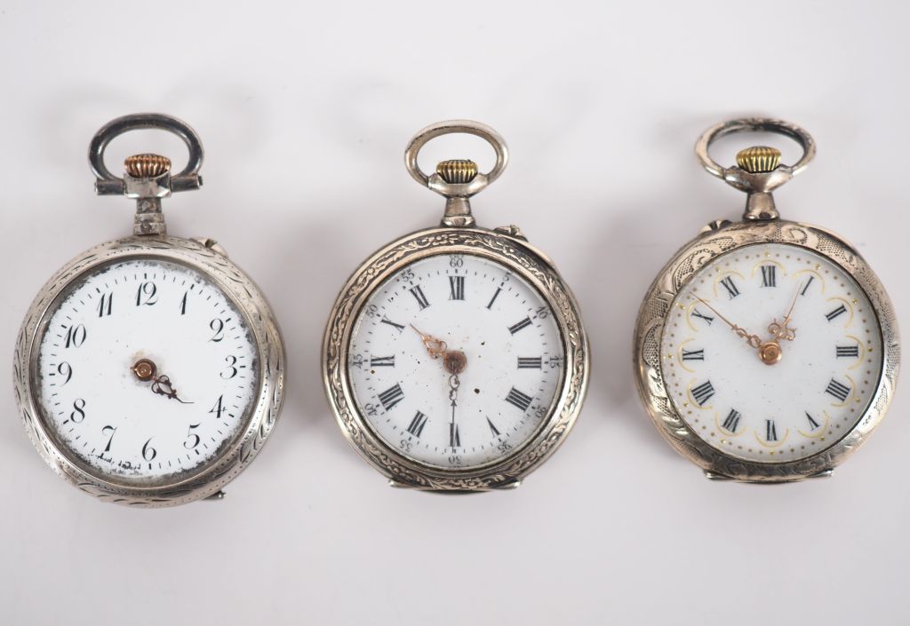 Ensemble comprenant : - une montre de col en argent. Cadran à chiffres romains pour les heures. Le revers, à décor de cartouche rocaille, feuillage et trophée. Diam. 28 mm Poids tel. 21,74 g - une montre de col en argent. Cadran à chiffres romains pour les heures et arabes pour les minutes. Le revers, à décor de cartouche et feuillage. Diam. 28 mm Poids tel. 19,77 g - une montre de col en argent. Cadran à chiffres arabes pour les heures. Le revers, à décor de cartouche et de fleurs. Diam. 28 mm Poids tel. 19,02 g (manque le verre, manque une aiguille, cadran usé)