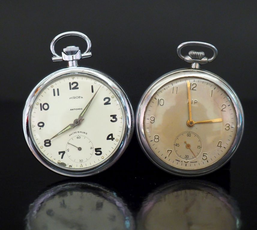 Ensemble de deux montres de poche en métal, l’une signée de la maison Lip et l’autre Pirofa, mouvement mécanique à remontage manuel. Vendue en l’état, traces d’usures visibles sur l’ensemble des boîtiers, il faut prévoir un rhabillage complet et une révision du mouvement, sans garantie. Expert : Geoffroy Ader - Ader Watches