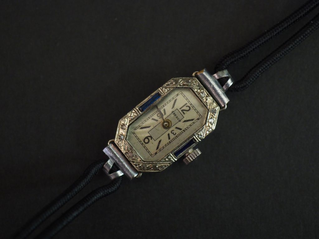 ERESCO Montre bracelet de style Art déco en or blanc. Boitier de forme octogonale sertie de petits éclats à l'imitation du diamant et de pierres bleues. Bracelet en coton noir. Long. 16 g Poids tel. 5 g (environ)
