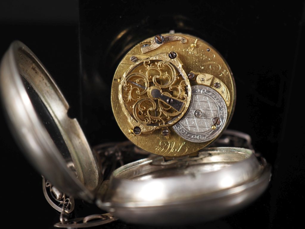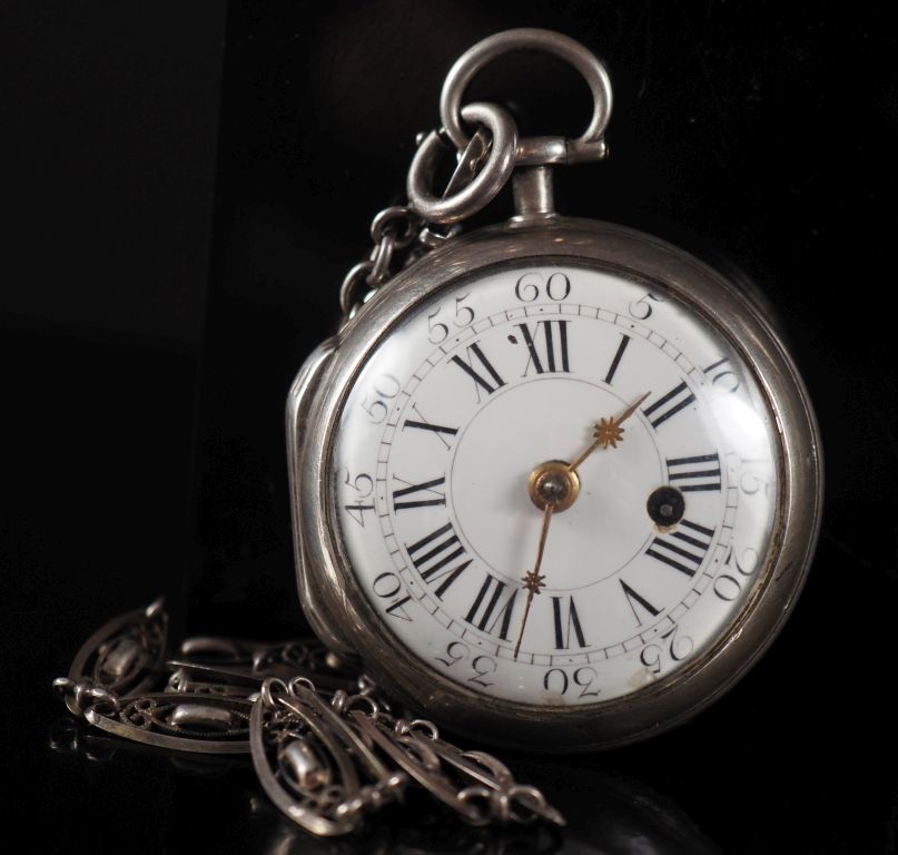 GOFFIN, à ANGERS Seconde moitié du XVIIIᵉ siècle Montre de poche en argent Cadran émail, chiffres romains pour les heures et arabes pour les minutes, minuterie chemin de fer, ouverture pour le carré de remontage. Mouvement mécanique, à coq (à réviser), remontage à clef. Diam. 48 mm Poids brut : 84,00 g. Avec une giletière en argent. Maître horloger établi à Angers, Eloy Goffin aurait été actif vers 1760/1780, sa signature se retrouve également sur plusieurs horloges d’édifice. Veuillez noter que cette montre est vendue en l’état. Le mouvement a été révisé et fonctionne. Boîtier avec signes d’usage et rayures. Un éclat à 5h sur le cadran. Veuillez noter que toutes les montres sont vendues en l’état. Aucune garantie sur l’état de fonctionnement. La plupart des montres ont été ouvertes pour identifier le type et la qualité du mouvement, y compris les montres résistantes à l’eau. Il est conseillé à l’acheteur de consulter un horloger pour revoir l’étanchéité de la montre. Les indications données sur l’existence d’une restauration, d’un accident ou sur l’état de préservation restent soumises à l’appréciation personnelle des acquéreurs. L’absence d’indication de pièces de remplacement, d’une restauration ou d’un accident n’implique nullement qu’un bien soit exempt de tout défaut présent. Tous les objets présentés sont susceptibles d’avoir fait l’objet d’un service antérieur et peuvent présenter des pièces non d’origine. Les dimensions et le poids des objets sont renseignés à titre approximatif. Expert : ADER WATCHES assisté de Justine LAMARRE