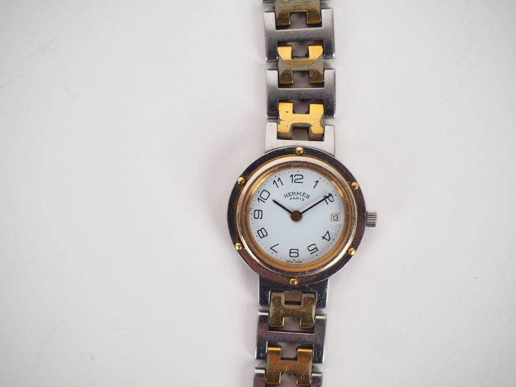 HERMES, Paris Montre bracelet, modèle Clipper, en acier et acier doré. Cadran rondà chiffres arabes pour les minutes sur fond blanc, Guichet dateur à 3h. Bracelet articulé ajouré, à décor de l'initial de la marque. Mouvement à quartz. Signé. Diam. 25 mm (usures)