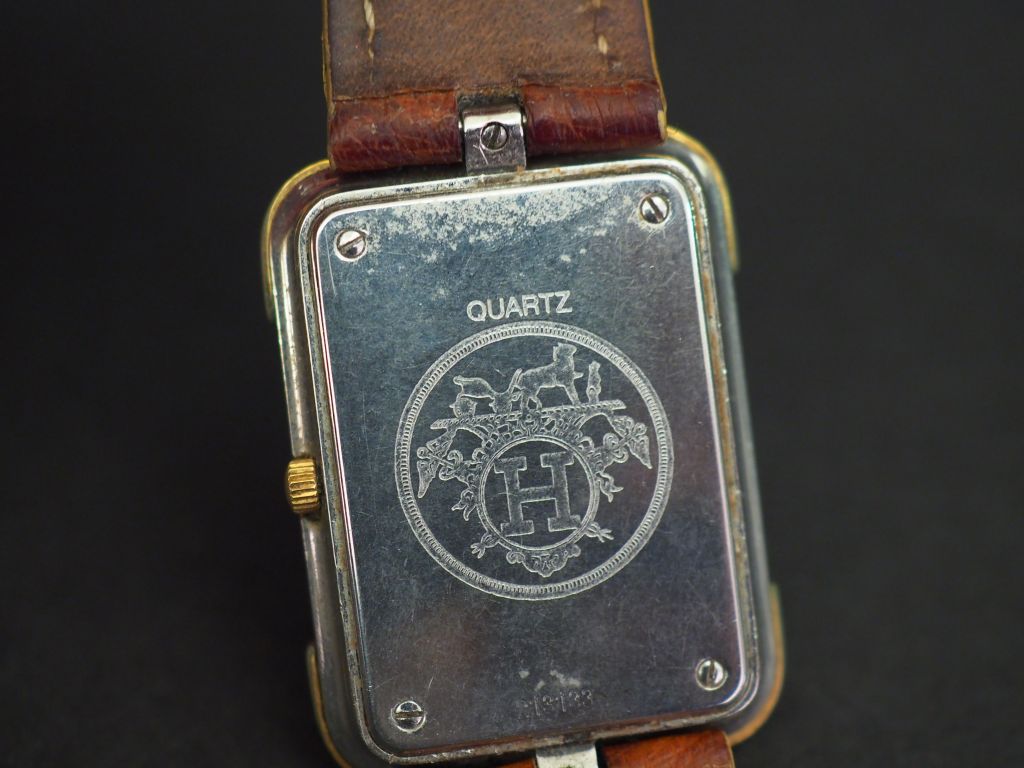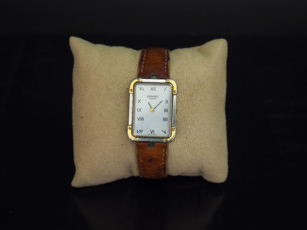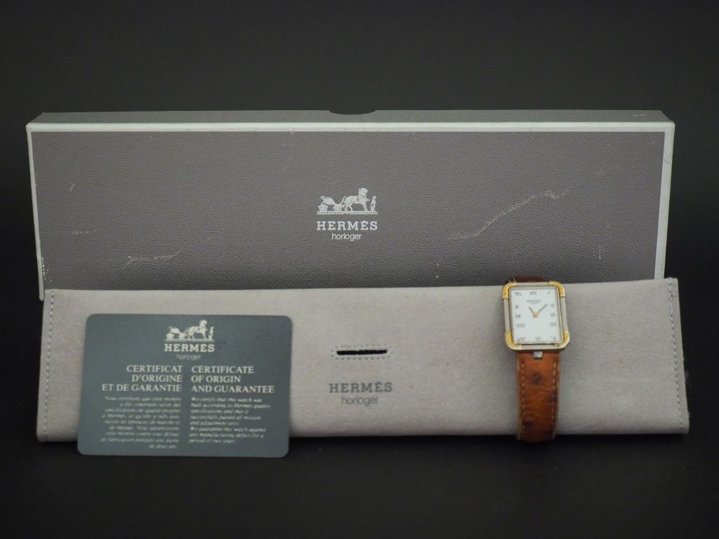 HERMES, Paris Montre de dame en métal et métal doré. Cadran rectangulaire à bords arrondis et chiffres romains pour les heures. Mouvement à quartz. Bracelet cuir probablement rapporté. Signée sur le cadran et au revers. Numérotée 213133. Avec son certificat d'origine et de garantie, sa boite et son étui. (usures)