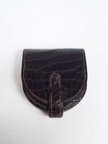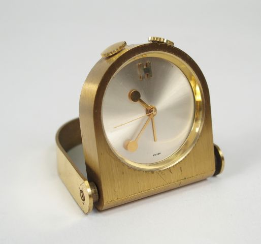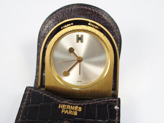 HERMES. Pendulette de poche en laiton, fond acier brossé, monogrammé H à midi (usures). Circa 1940-1950. Dans son étui d'origine. Numéro de série: 33157