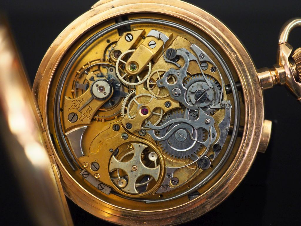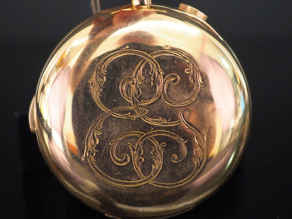 INVICTA Début XXe siècle Montre de poche savonnette avec chronographe et sonnerie Boitier rond sur charnière, le dos avec des initiales, cuvette en or signée (remontoir est endommagé) Cadran émail blanc avec chiffres arabes stylisés, minuterie chemin de fer, graduation 1/5e de seconde, aiguilles stylisées, petite trotteuse Mouvement mécanique avec remontage à couronne, balancier spiral bimétallique, sonnerie marteau sur fond avec volant pour le frein, réglage avance/retard sur le pont de balancier Diam. 60 mm Poids brut. 122 g Vendue en l’état, traces d’usures et accidents sur la couronne, prévoir un rhabillage complet et une révision du mouvement, mécanisme de sonnerie et chronographe , sans garantie. Expert : Geoffroy Ader - Ader Watches