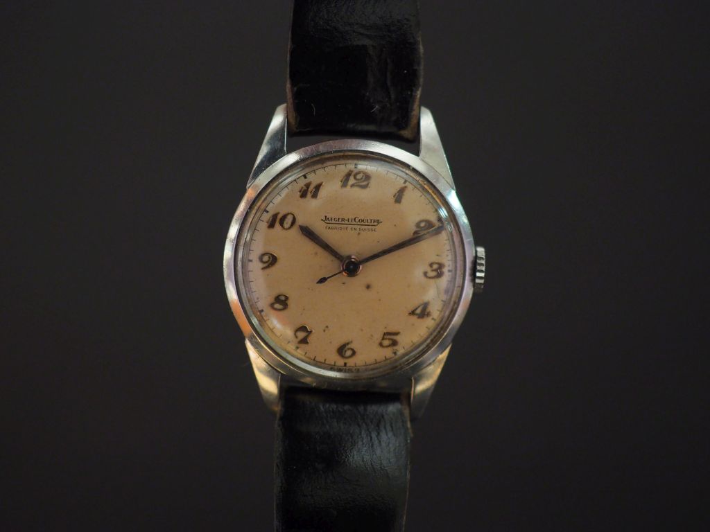 JAEGER LECOULTRE Montre bracelet en acier. Cadran rond à chiffres arabes pour les heures. Bracelet cuir noir, boucle ardillon. Signée sur le cadran et le mécanisme. Numérotée au revers du boitier 425173 et sur le mécanisme 542645. Diam. 25 mm Dans son écrin. (bracelet usé, cadran légèrement taché)
