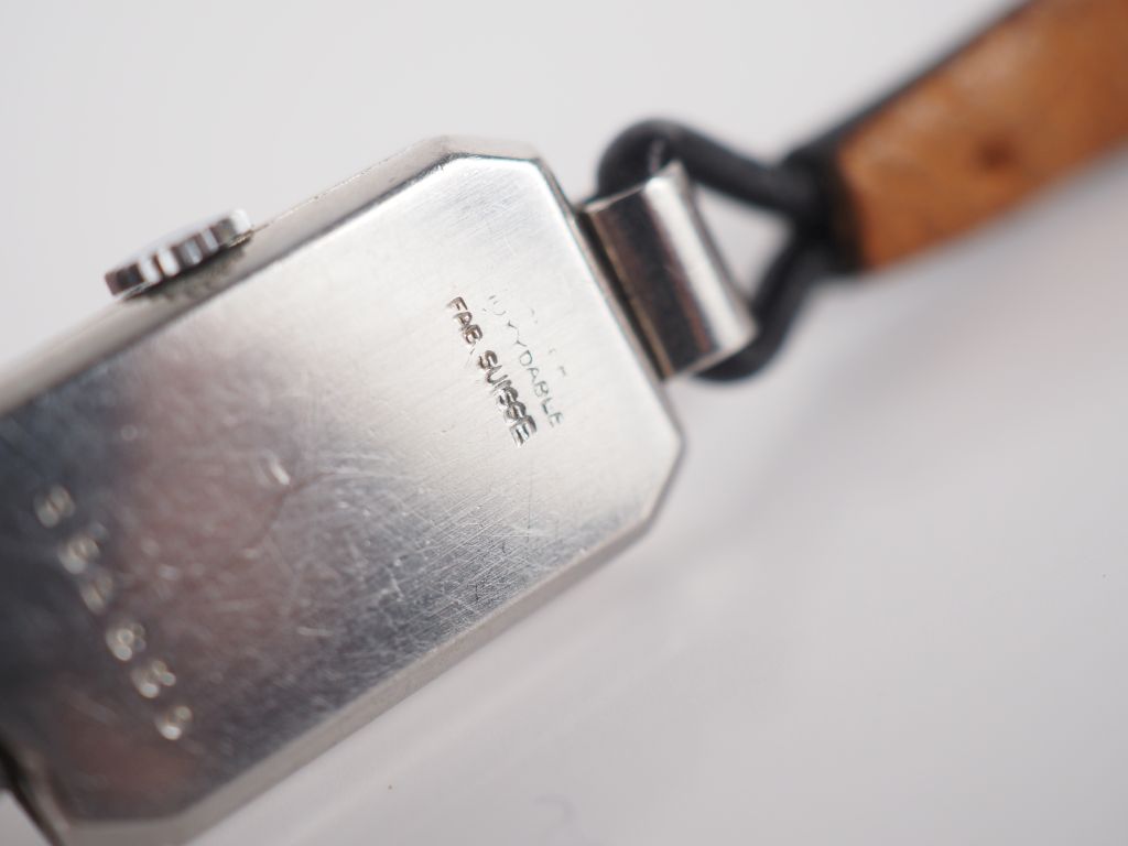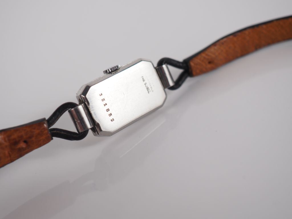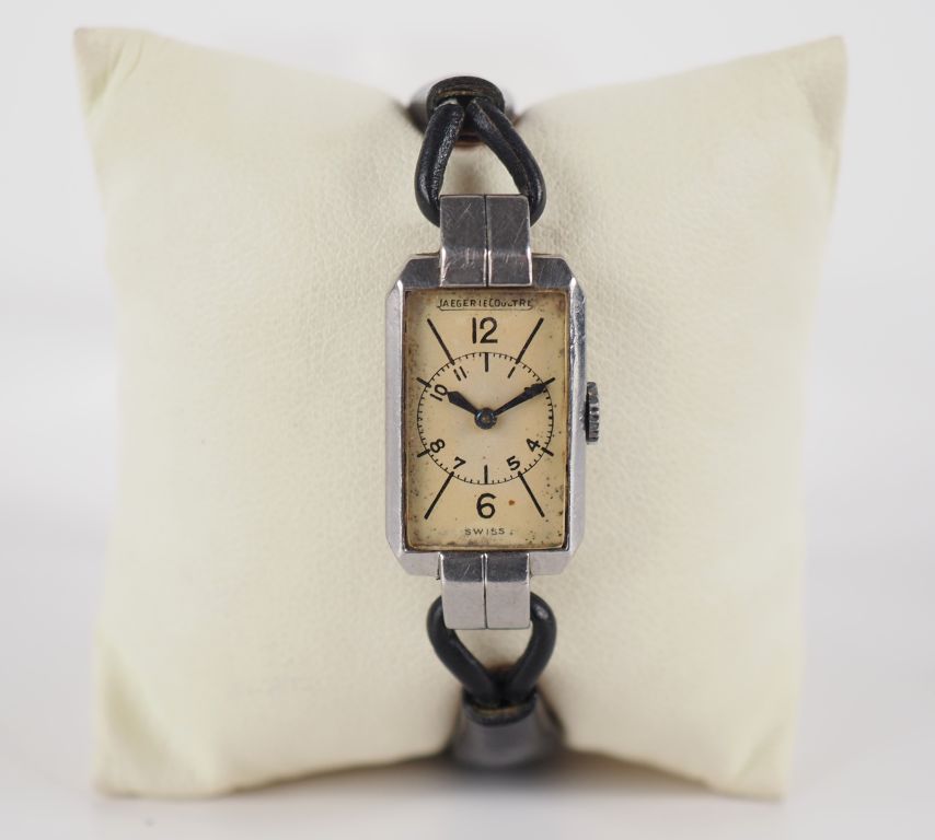 JAEGER LECOULTRE Petite montre bracelet de dame de style Art déco en acier. Cadran à chiffres romains et index bâtons. Bracelet noir, boucle ardillon. Signée. 22 x 13 mm (vendue en l'état, sans garantie)
