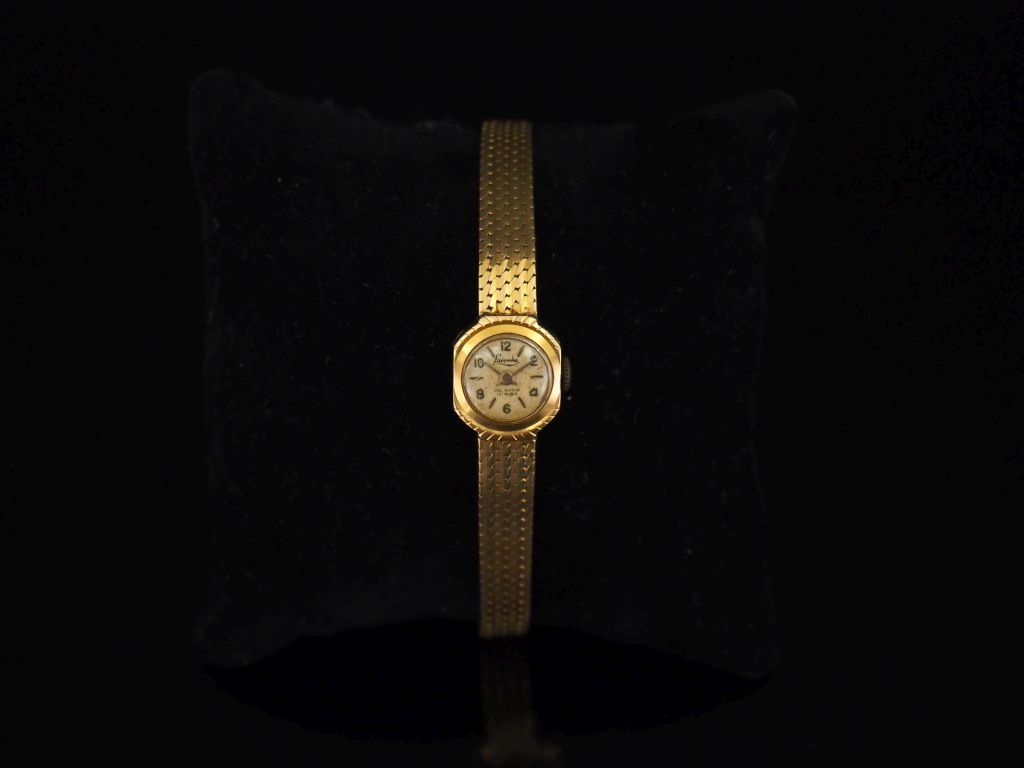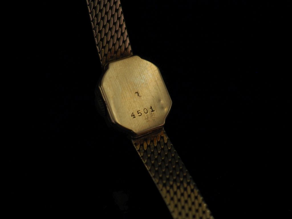 LACORDA, Montre bracelet, boitier et bracelet en or jaune 750. Cadran à pans coupés, chiffres arabes et index bâtons pour les heures. Bracelet souple, maille plate tressée. 1,6 x 1,4 cm Long. 17 cm Poids tel. 24,56 g