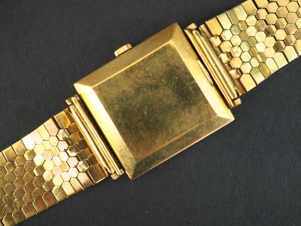 LONGINES Montre bracelet d’homme, bracelet et boitier en or jaune. Cadran rectangulaire, à index bâtons pour les heures. Bracelet souple, maille plate articulée. Signée sur le cadran. Long. 15 cm Poids tel. 51,66 g (verre légèrement accidenté, petites usures au cadran)