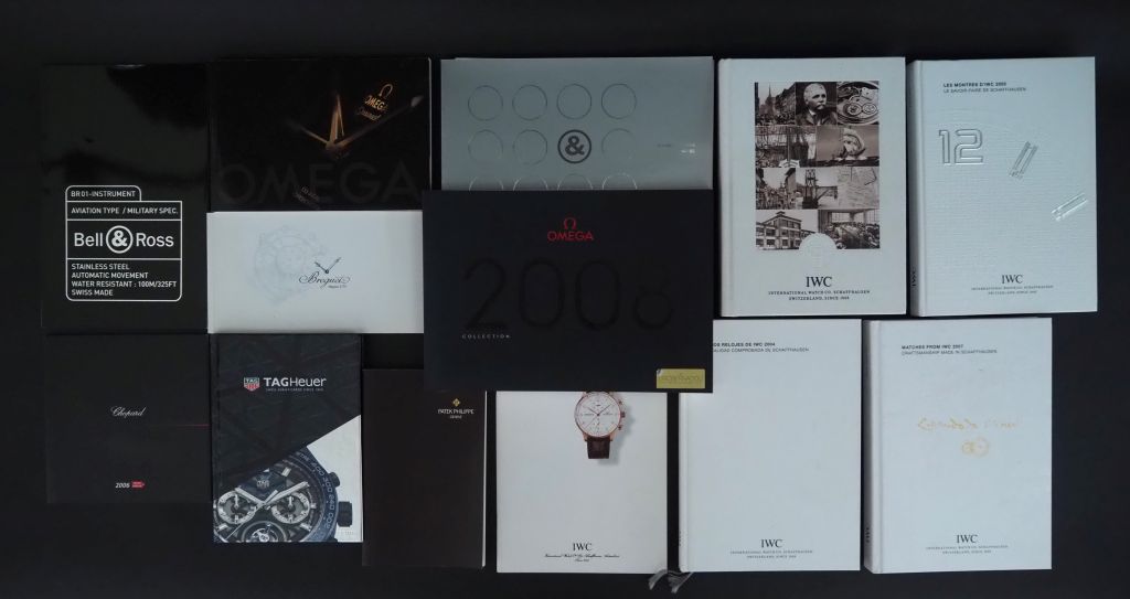 Lot de 13 catalogues de montres : IWC (2004/2005/2007/2008) + Portugaise OMEGA (2008) OMEGA (2004) BREGUET PATEK PHILIPPE (2004-2005) CHOPARD MILLE MIGLIA (2006) BELL ROSS (2004-2005) BELL ROSS (BR 01) TAGHEUER (2018-2019)