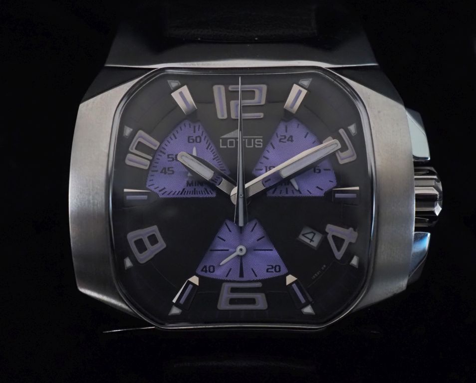 LOTUS Ref. 15501 Montre bracelet en acier. Cadran à trois compteurs violets, chiggres arabes, index appliqués et aiguilles luminescents. Bracelet cuir noir, coutures violettes, boucle déployante. Fond vissé. Signée. 32 x 40 cm Dans sa boite, avec son certificat de garantie internationale.