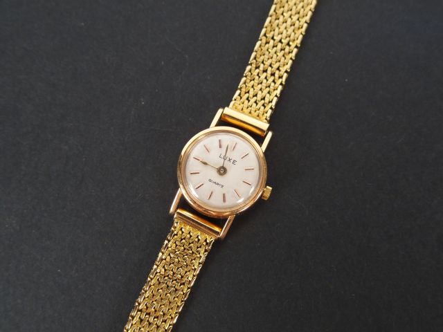 LUXE. Montre de dame, boitier rond et bracelet semi rigide en or jaune 14K. Poids tel: 25,1gr