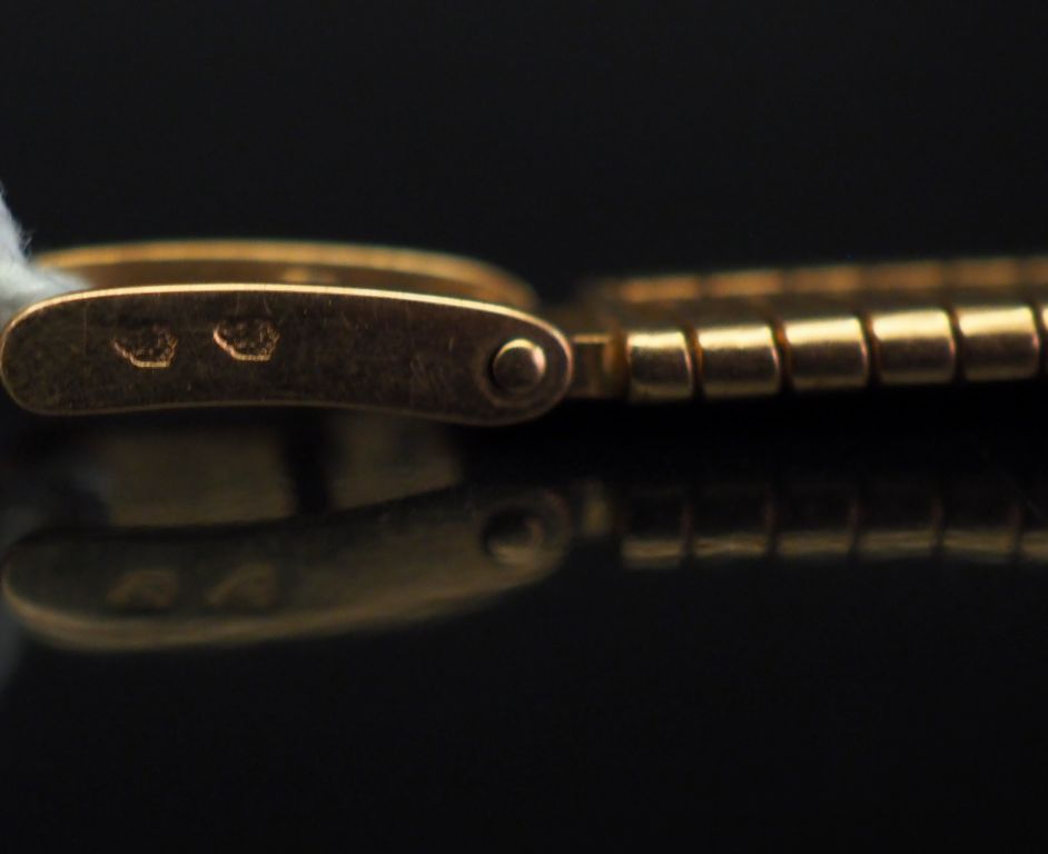 Montre bracelet de dame, boiter et bracelet or jaune. Cadran rond à chiffres arabes et index batons pour les heures. Bracelet articulé maille plate. Long. 17,5 cm Poids tel. 20,47 g