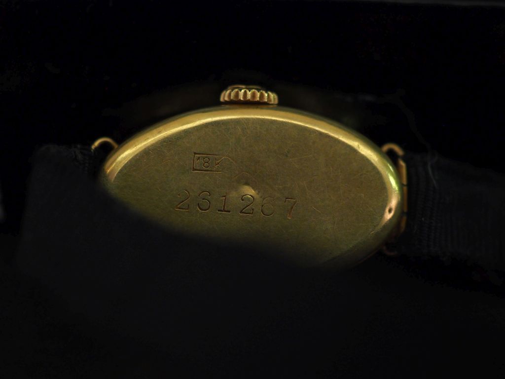Montre bracelet de dame, boitier en or jaune 750. Cadran de forme ovale à chiffres arabes pour les heures. Le pourtour, à décor de fleurs et feuillage. Bracelet en tissu, fermoir en métal. 25 x 16 mm Poids tel. 8 g environ (bouton poussoir en métal doré usé, manque une aiguille)