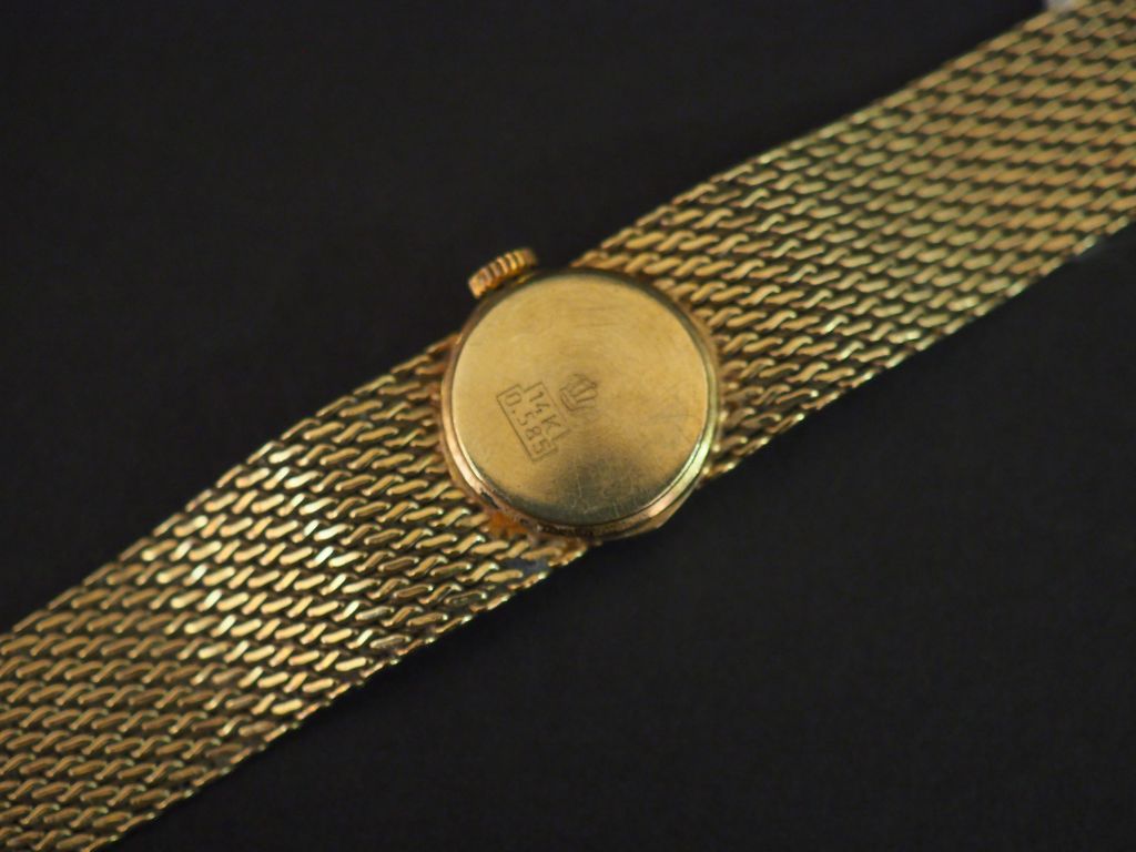 Montre bracelet de dame, boitier et bracelet en or jaune 14k. Caran rond à chiffres arabes et index batons pour les heures. Bracelet souple, maille plate tressée. Long. 16,5 cm Poids tel. 36,17 g