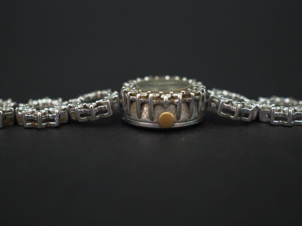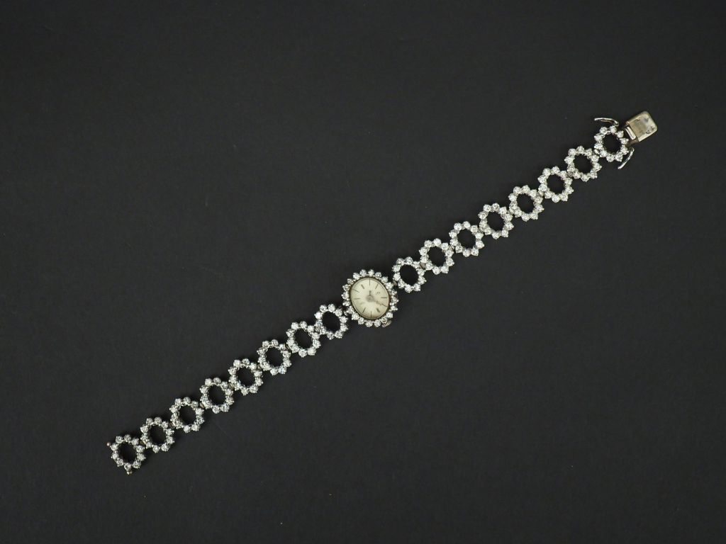 Montre bracelet de dame en or blanc et diamants. Cadran ovale à index bâtons pour les heures. Long. 17 cm Poids tel. 27,62 g