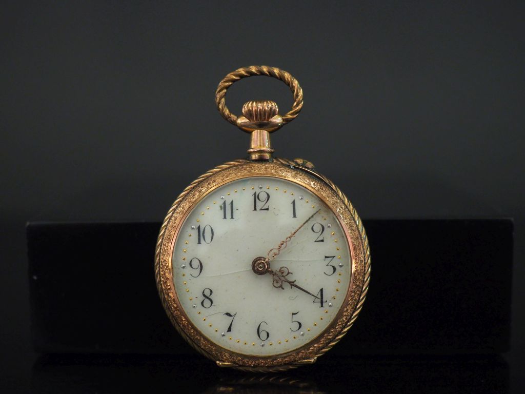 Montre de col en or jaune 9k. Cadran à chiffres arabes pour les heures. Le revers, à décor émaillé d’iris. Double fonds en métal. Diam. 30 mm Poids tel. 21,70 g