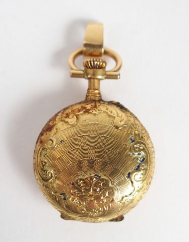 Montre de col en or jaune, cadran émail, chiffres romains, décor d'arabesques. Poids tel: 14,2gr