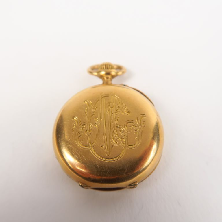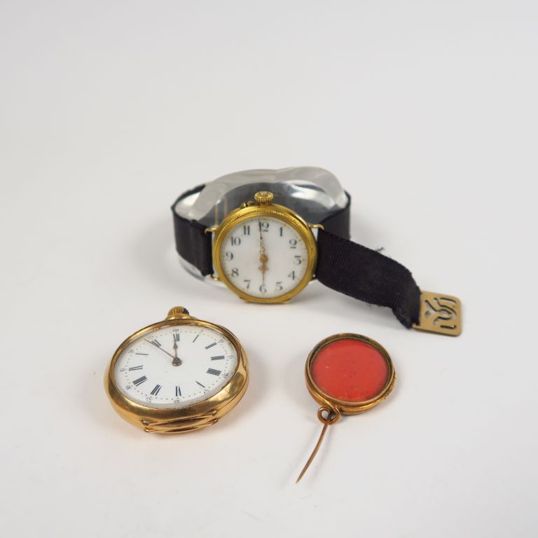 Montre de col en or jaune, fond à décor de monogramme, cadran émaillé. Poids tel (sans le verre). 23,80 g (verre à refixer) On y joint : - une montre de col transformée en montre bracelet, boitier or. Poids tel. 17 g - une broche porte-photo en or jaune 14k. Poids tel. 4,36 g