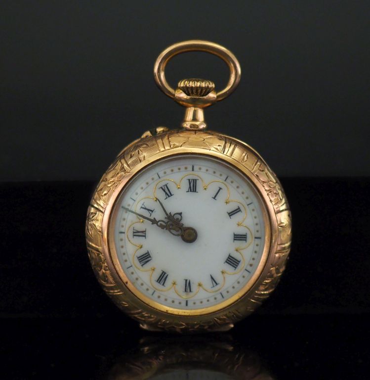 Montre de col Napoléon III en or jaune 750. Cadran à chiffres romains pour les heures. Le revers, à décor de cartouche, fleurs et feuillage. Le pourtour, à décor gravé de rinceaux, feuillage et fleurettes. Double fonds en or jaune 750. Diam. 29 mm Poids tel. 18,32 g